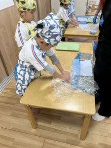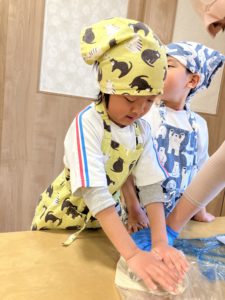 粉に触れたり、生地をこねたりしながら、感触や変化を楽しむ子どもたち。