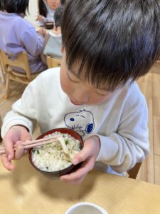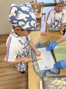 友だちと協力しながら作ったうどんは、細くても極太でも、いつも以上においしく感じられたようで、笑顔いっぱいのおやつの時間となりました。