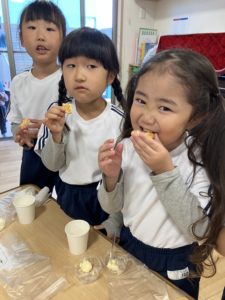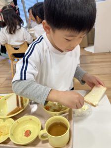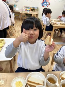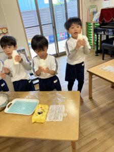 4,5歳児はバター作りにチャレンジしました。生クリームと少しの牛乳を入れた容器を振り続けると、だんだん固まってバターに変身!