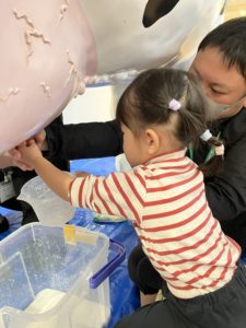 子どもたちは、牛の模型を使った搾乳体験に挑戦!指の動かし方や力の入れ方を教わり、初めての搾乳にドキドキ。