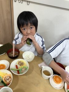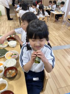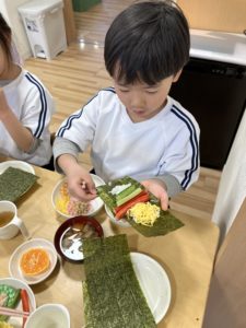 鬼退治を終えたあとは、子どもたち自身でオリジナル恵方巻を作りました。