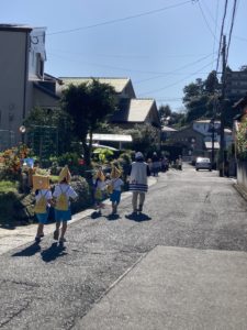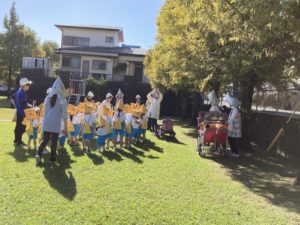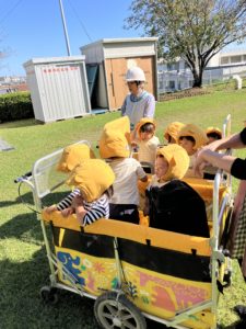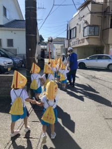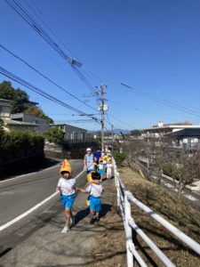 地震発生の放送を聞いた子どもたちは、保育者の声掛けに落ち着いて耳を傾け、速やかに高台にある指定避難場所(大淀台公園)への避難を実施しました。